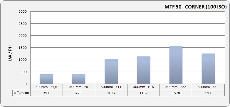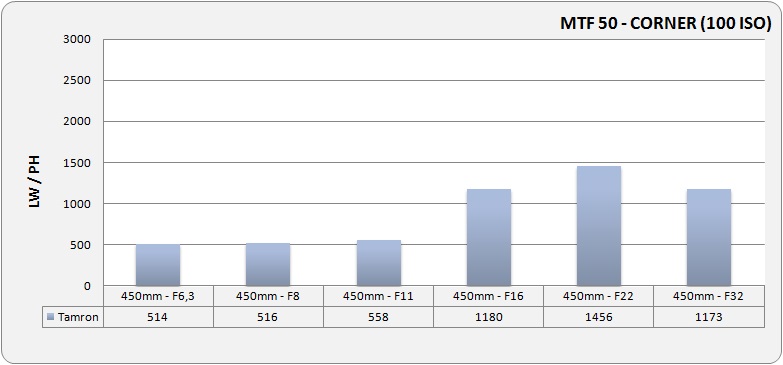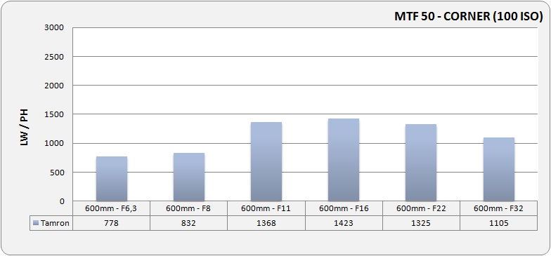 Agli angoli del fotogramma, e questo vale a qualsiasi focale, la nitidezza si riduce molto - si rende necessario diaframmare di diversi stop per ottenere una nitidezza accettabile. Considerate però anche nitidezza al centro dell'immagine e necessità di scattare con tempi brevi, riteniamo che f/8- f/11 rimangano i diaframmi di lavoro preferenziali per questo obiettivo.
