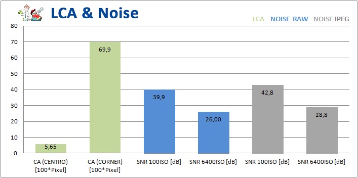 L'ottica di pregio fa un buon lavoro nel contenere le aberrazioni cromatiche, che però su questo corpo macchina risultano più marcate - ogni difetto viene amplificato a 42 Mpixel! In ogni caso, le aberrazioni sono assolutamente invisibili al centro dell'immagine, e appena sopra la soglia di visibilità (0,5 pixel) agli angoli estremi. Ricordiamo che, per favorire la leggibilità del grafico, l'aberrazione cromatica laterale è espressa in pixel*100.