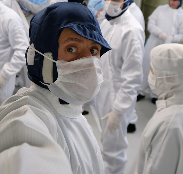 Molto interessante è stata la visita nelle parti dello stabilimento che ospitano la costruzione delle ottiche: per entrare abbiamo dovuto vestirci di tutto punto con apposite tute e calzature: è infatti importante che le operazioni si svolgano in un ambiente privo di polvere. Naturalmente anche tutti gli operai e le operaie addette a costruzione e calibrazione erano dotati dello stesso abbigliamento. Avevamo dovuto lasciare già le scarpe all'ingresso, indossando delle ciabatte per girare all'interno degli ambienti dello stabilimento, ma l'accesso alle linee produttive delle ottiche ha richiesto precauzioni ulteriori. Ad esempio carta e matite sono state tenute ben lontane, e gli unici fogli che ci è stato permesso portare all'interno sono stati quelli della presentazione delle linee, costituiti da una speciale carta antistatica che non produce o attira polvere. Anche le tracolle delle macchine fotografiche sono dovute rimanere all'esterno. Stivali, tuta intera, cappuccio, mascherina e guanti di plastica fino a metà avambraccio hanno costituito il nostro abbigliamento, rendendo l'esperienza della visita davvero particolare.