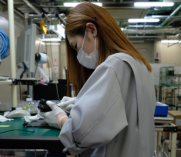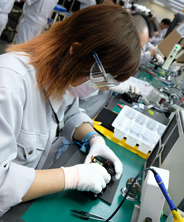 È davvero incredibile osservare la manualità con cui nascono questi piccoli gioielli tecnologici e la precisione dei movimenti con cui vengono assemblati e controllati. Il montaggio delle ghiere (composte da decine di componenti), l'applicazione della finitura in simil pelle, l'assemblaggio delle ottiche: tutto avviene con movimenti veloci e precisi con una flessibilità che le macchine non sarebbero capaci di ripetere. Ogni operaio è specializzato in una delle fase della produzione e arriva alla linea di montaggio dopo un training abbastanza lungo. Molto interessante anche dare un occhio al controllo qualità, con operaie in grado di valutare - ad esempio - il perfetto funzionamento delle ghiere con movimenti precisi e impostati, passando di campione in campione in davvero pochi secondi.