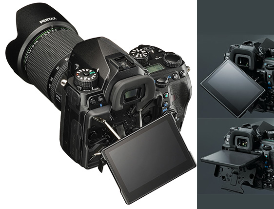 Il display posteriore da 3,2" (con proporzioni 3:2 e 1037k punti) adotta un particolare meccasnimo di snodo che, pur non decentrando di molto il monitor, permette non solo l'inclinazione in alto e in basso, ma anche laterale. L'otturatore è stato disegnato con meccanismi di riduzione delle vibrazioni, è garantito per 300.000 cicli e permette di scattare fino a 1/8000 di secondo. La raffica a si attesta a 4,4 fps a piena risoluzione, con una profondità di 17 fotogrammi in RAW e 70 in JPEG. In modalità ritaglio sale a 6,5fps, rispettivamente con 50 e 100 fotogrammi di profondità. I RAW vengono registrati a 14 bit. Sul fronte video Pentax K-1 acquisisce filmati in formato Full HD (1920 x 1080 pixel; frame rate 60i/30p) nel formato di registrazione H.264, ed è equipaggiata con un ingresso per microfono stereo esterno (con meter e possibilità di regolazione separata dei canali) e un ingresso per cuffia: per il formato 4K è disponibile la ripresa intervallata per creare automaticamente filmati stop motion.