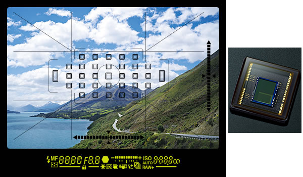 Il sensore è un CMOS pieno formato (24x35,9mm) da 36,4 megapixel, di chiara provenienza Sony, come d'altra parte anche i sensori che equipaggiano le APS-C. Pentax fa lavorare il sensore in accoppiata con il suo nuovo processore d'immagine PRIME IV fino alla sensibilità massima di 204.800 ISO, partendo dal valore di 100 ISO. Per K-1 Pentax ha scelto un nuovo modulo AF SAFOX 12 con un’area autofocus espansa che fa leva su 33 sensori AF (25 sensori di tipo a croce disposti al centro) e che dichiara sensibilità fino a -3EV. Il sensore centrale e i due sensori posti immediatamente sopra e sotto a quello centrale sono progettati per lavorare al meglio con ottiche F2,8, facilitando la messa a fuoco più precisa quando si utilizza un obiettivo molto luminoso. L'algoritmo Real-Time Scene Analysis System dovrebbe garantire buone prestazioni autofocus durante l'inseguimento dei soggetti, sfruttando anche le informazioni cromatiche in arrivo dal sensore esposimetrico RGB da circa 86.000 pixel. Il mirino ottico è il particolare attorno cui è costruita una reflex e su una full frame non può che adottare un pentaprisma: Pentax dichiara una copertura del 100% del campo inquadrato e in ingrandimento pari a 0,7x. Interessante l'adozione di uno schermo di messa a fuoco Natural Bright Matt III, che dovrebbe garantire la possibilità di mettere a fuoco facilmente anche manualmente, particolare non da poco per una reflex che è compatibile con tutte le ottiche reflex di Pentax, comprese quelle dei tempi della pellicola. Quelle nate per il formato ridotto APS-C saranno utilizzabili in modalità ritaglio automatico con scatti a 15 megapixel.