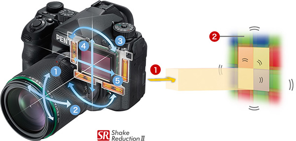Quest'ultima tecnologia è denominata Pixel Shift Resolution System e rispetto a quanto visto in sistemi simili (citiamo Hasselblad e Olympus) offre anche una funzione di correzione del movimento che rileva automaticamente lo spostamento di un oggetto in fase di ripresa continua, minimizzando gli effetti indesiderati durante il procedimento di sintesi delle quattro immagini, superando uno dei limiti delle multiesposizioni e adattandosi a una gamma più ampia di situazioni e soggetti. Questo è un punto che sarà interessante valutare sul campo. Tra gli assi di stabilizzazione c'è anche quello che controlla il rollio (difficilmente correggibile quando la stabilizzazione è integrata nell'ottica): questo ha permesso a Pentax di abilitare anche la funzione di livellamento automatico delle foto, per mettere al riparo dagli orizzonti storti. Non manca poi la funzione Astro Tracer, già vista sulle APS-C e dedicata agli astrofili: il movimento del sensore può essere utilizzato nelle lunghe esposizioni per inseguire le stelle, facendo leva anche sui dati in arrivo dal GPS integrato. Tornando alla funzione primaria del sistema SR, in termini di stabilizzazione Pentax dichiara di riuscire a spostare il tempo di sicurezza di ben 5 stop; inoltre la macchina rileva automaticamente il panning, disabilitando un asse di stabilizzazione, senza che il fotografo debba cambiare la modalità dello stabilizzatore prima dello scatto.