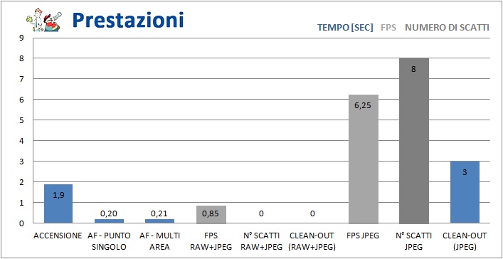 Buone le prestazioni del sistema autofocus, ma la cadenza di scatto è accettabile solo in formato JPEG. Il numero di scatti RAW+JPEG è infinito, ma solo a causa della modesta cadenza.