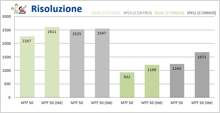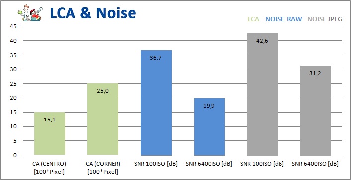 Buon risultato tanto dai test di aberrazione cromatica quanto da quelli di rumore, anche se i sensori Sony da 1 pollice fanno leggermente meglio. Molto alto il rapporto S/N del JPEG, indice di un pesante intervento dei filtri di denoise.