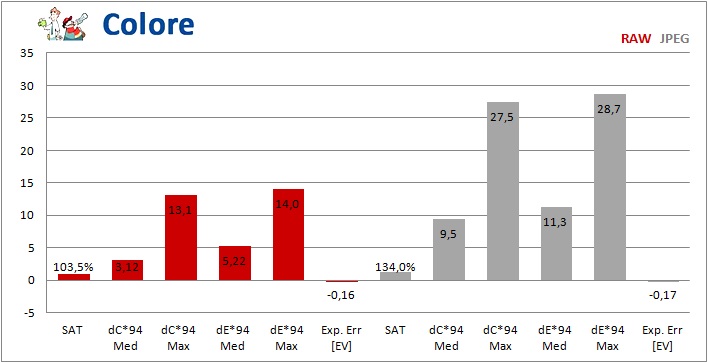 Comportamento cromatico impeccabile per il RAW. Il risultato del JPEG è influenzato negativamente da un bilanciamento del bianco non ottimale in presenza di luci artificiali (come quelle usate nei test), che genera una dominante magenta.