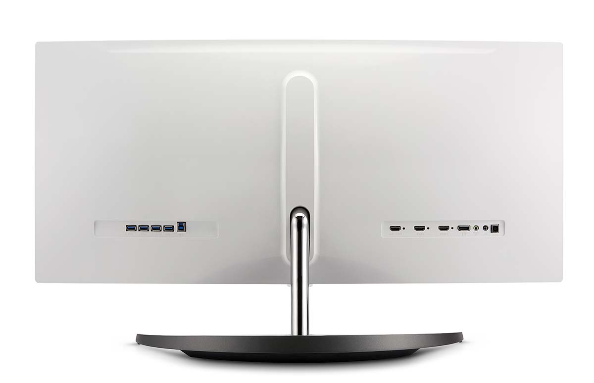 Il pannello posteriore, di accessibilità immediata essendo i connettori disposti sulla superficie verticale, prevede nell'ordine: HUB USB 3.0 (a sinistra della colonna centrale), MHL-HDMI, HDMI 1 (1.4), HDMI 2 (2.0), DisplayPort, ingresso audio, uscita cuffie e connettore di alimentazione. Proprio l'uscita cuffie è l'unico connettore su cui abbiamo qualche riserva: un accesso frontale, data la presenza dei diffusori integrati nella base di appoggio, sarebbe stato certamente più pratico.