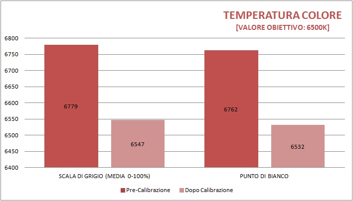 Già in assenza di calibrazione specifica, ma utilizzando il profilo fornito su CD, la temperatura colore del punto di bianco e quella media della scala di grigio sono piuttosto vicine a quella obiettivo dello standard sRGB: 6762 K e 6779 K, rispettivamente, contro 6500 K ideali. A partire dal 25% di luminosità, lo scarto è contenuto entro i 300K.