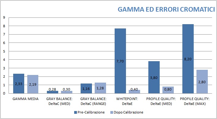 Dopo calibrazione, gli scarti dE medio e massimo sono pari, rispettivamente, a 0,8 punti e 2,8 punti - altri due dati molto buoni, considerando che un errore dE di 5 punti è considerato il minimo rilevabile da un occhio ben allenato.