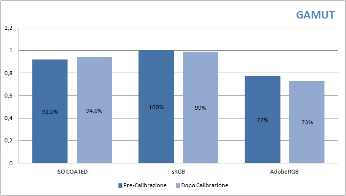 L'ampiezza misurata del gamut è coerente con quanto dichiarato a livello di specifica: 99% dello spazio sRGB dopo calibrazione, corrispondente al 73% dello spazio Adobe RGB e al 94% dello spazio ISO Coated.