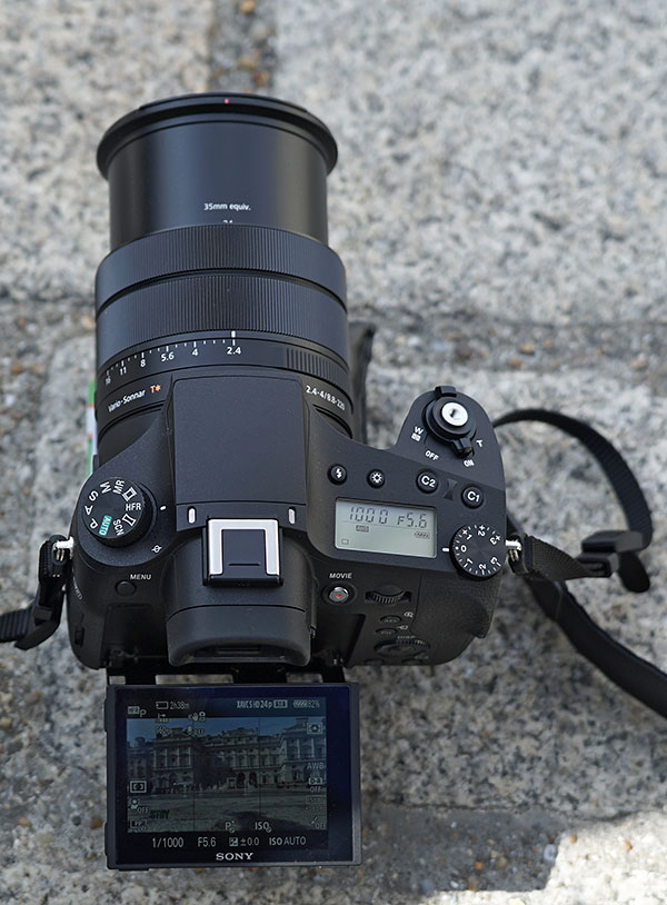 A livello ergonomico le dimensioni maggiori hanno permesso a Sony di organizzare in modo differente la calotta superiore, con una disposizione dei tasti vicino al display LCD secondario più razionale. Il profilo posteriore è invece immutato, con lo stesso display orientabile e uguale disposizione dei tasti. Le maggiori dimensioni dell'ottica hanno permesso a Sony di integrare una terza ghiera sul barilotto, che va ad aggiungersi a quella per la regolazione dei diaframmi e quella principale: in questo modo è possibile avere a portata di mano sia la messa a fuoco manuale sia la regolazione dello zoom direttamente con la mano sinistra. Unendo la nuova ghiera alla più razionale disposizione dei tasti nella calotta superiore si può dire che sul fronte dell'ergonomia Sony RX 10 III è un passo avanti rispetto alla versione II.