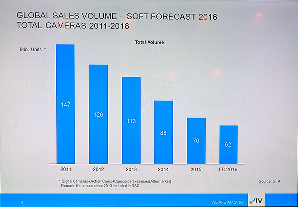 "Abbiamo fatto un grosso errore negli anni passati come industria" - ha detto Herr Oster durante il suo intervento - "Abbiamo lasciato passare l'idea che la qualità fotografica degli smartphone fosse sufficiente per tutto". I telefonini sono certamente la spina nel fianco dell'industria fotografica (anche se più avanti vi dimostrerò che questo assunto non è del tutto vero): a partire dal 2011 l'erosione del mercato 'hardware' fotografico da parte dei camera-phone è stato impressionante, come è reso evidente dalla diapositiva riportata qui sopra. Il numero di pezzi venduti nel segmento delle fotocamere si è più che dimezzato. Nel contempo però il numero delle fotografie scattate è aumentato in modo esponenziale. La presentazione di iPhone nel 2007 (data presa come pietra miliare per il settore da Oster) non ha però semplicemente avuto un impatto sul mercato, ma ha cambiato radicalmente il modo di fare comunicazione, ha rivoluzionato il modello di business. Gli smartphone hanno trasformato quella che ci circonda nella società dell'immagine, dove spesso comunichiamo senza utilizzare nemmeno una parola, ma facendo parlare semplicemente una foto, un'animazione, un breve filmato. Questo ha aperto nuovi spazi di business nel campo della memorizzazione (vista l'impennata del numero di fotografie scattate e della risoluzione), delle tecnologie di condivisione. È diminuito lo spazio di azione degli apparecchi fotografici intesi come puro hardware, ma si sono aperte praterie sul fronte dei servizi, con il cloud in cima alla lista delle risposte. Una fiera con una profonda anima B2B non può restare indifferente di fronte a questi cambiamenti e deve saper dare spazio alle nuove soluzioni che permettono di dare risposte efficaci e immediate alle mutate esigenze dei professionisti. In questo senso anche l'ospitalità data alle start-up va letta come la ricerca di risposte agili e moderne alle domande dei fotografi, risposte che spesso le grandi aziende - per la grandezza della loro struttura- non riescono a fornire. La comunicazione per immagini vede già oggi transitare 1,8 miliardi di immagini al giorno sui social media, con una previsione di 44 trilioni di GB scambiati per il 2020.