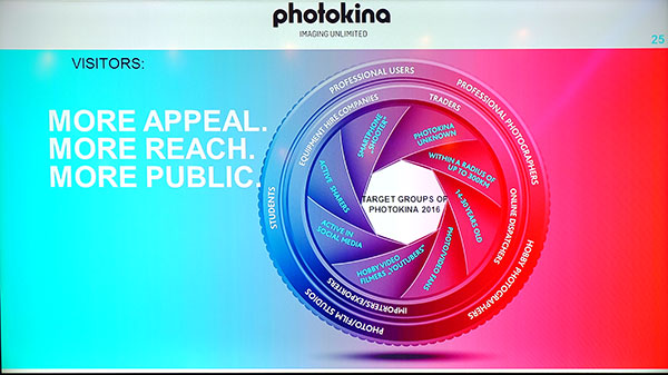 Due anni fa (Photokina si svolge ad anni alterni, per la precisione in quelli pari) la fiera aveva ospitato più di 183.000 visitatori, in arrivo da 160 Paesi, con più di mille espositori. Uno degli aspetti che ha permesso a Photokina resistere anche negli anni più difficile è stato il fatto di avere ben chiaro qual è il focus della manifestazione: è innanzitutto un evento dedicato ai professionisti, alla distribuzione, in cui l'aspetto B2B è preponderante. È una fiera dove gli espositori vanno per fare affari, non solo per mettere in mostra i loro prodotti. Anche per questo motivo è necessario che sappia interpretare al meglio i mutamenti del mercato, aspetto che il nuovo format della fiera prova a rinnovare con l'attenzione verso nuovi settori in crescita. Nel mercato, accanto alla fotografia tradizionale, stanno emergendo in modo chiaro alcuni temi che Photokina proverà ad intercettare dedicando ampio spazio a queste tre tematiche: Video, Realtà Virtuale e Aumentata, Droni e Action Camera. Ne ha parlato durante la conferenza Markus Oster, Vice Presidente della Fiera di Colonia (Koelnmesse GmbH). Un intero padiglione (il numero 5) sarà dedicato a 'Photokina Motion' una nuova area dove troveranno spazio strumenti e applicazioni per il mondo della ripresa di immagini in movimento. Inoltre la presenza dei video sarà pervasiva all'interno di tutto il tessuto espositivo della fiera, dove le immagini in movimento prenderanno il posto di cartelloni e altre immagini prima statiche.