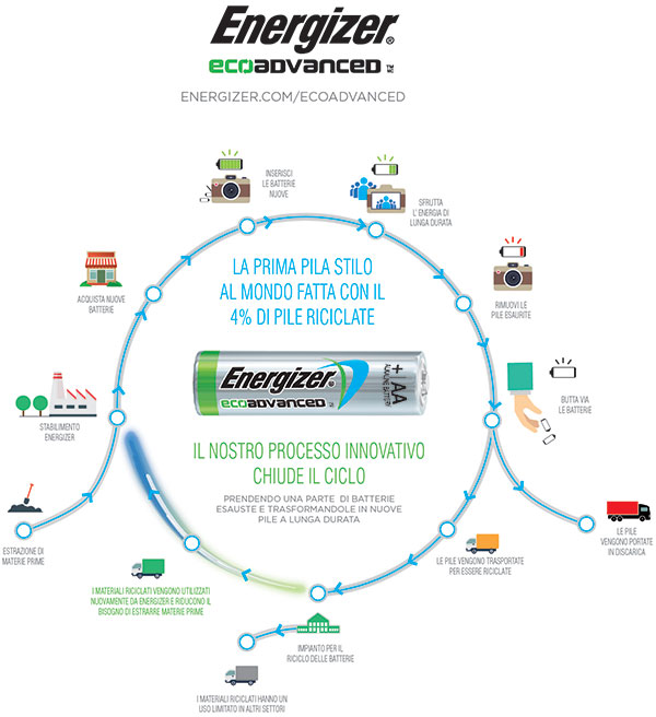 In questo settore il riciclo non è ancora una pratica standardizzata, anche se le legislazioni sono interventute per favorire pratiche di recupero. Energizer punta proprio su questo tema per lanciare la sua nuova pila top di gamma, la nuova Energizer Eco-Advanced, prima pila stilo sul mercato prodotta in parte con pile riciclate. È frutto di 7 anni di ricerche nei laboratori del produttore statunitense. La nuova batteria, declinata in formato stilo AA e ministilo AAA, è destinata a sostituire gradualmente in gamma l'attuale Energizer Hi-Tech, posizionandosi allo stesso prezzo. Al momento si tratta per Energizer di un investimento, ma un domani il riciclo dovrebbe portare a importnati risparmi sul fronte dell'approvvigionamento di materie prime, quindi anche a prezzi più bassi e all'estensione della tecnologia anche alle serie non 'premium' delle sue batterie.