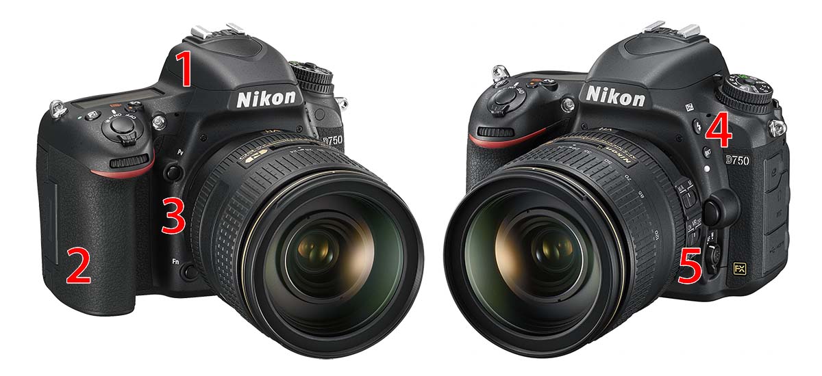 (1) - Leggermente più ingombrante della Df, la D750 è comunque una Full Frame tra le più compatte. Il suo corpo monoscocca è un mix di policarbonato e lega di magnesio che assicura un ragionevole compromesso tra leggerezza e robustezza.