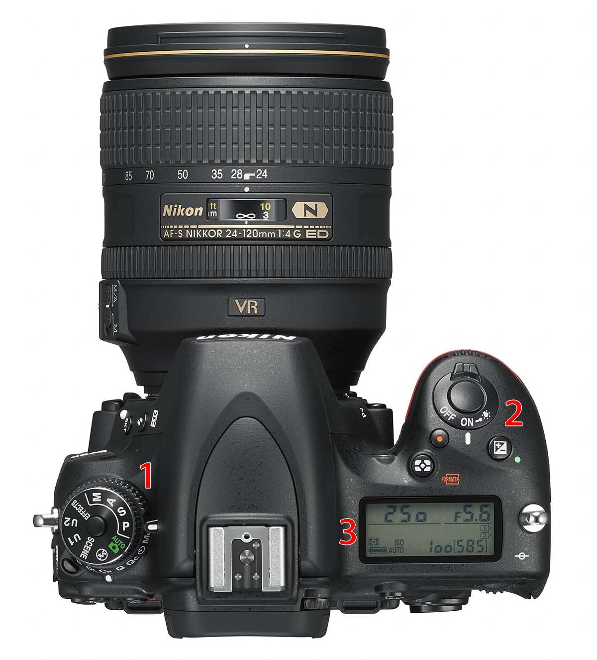 (3) - Il display secondario della D750 è più sottile rispetto ad altri modelli, a causa del ridotto spessore della fotocamera. Non è minuscolo come quello adottato dalla Df, e le informazioni sono dunque piuttosto complete; manca però l'indicazione del WB, ora impostabile solo tramite display posteriore.
