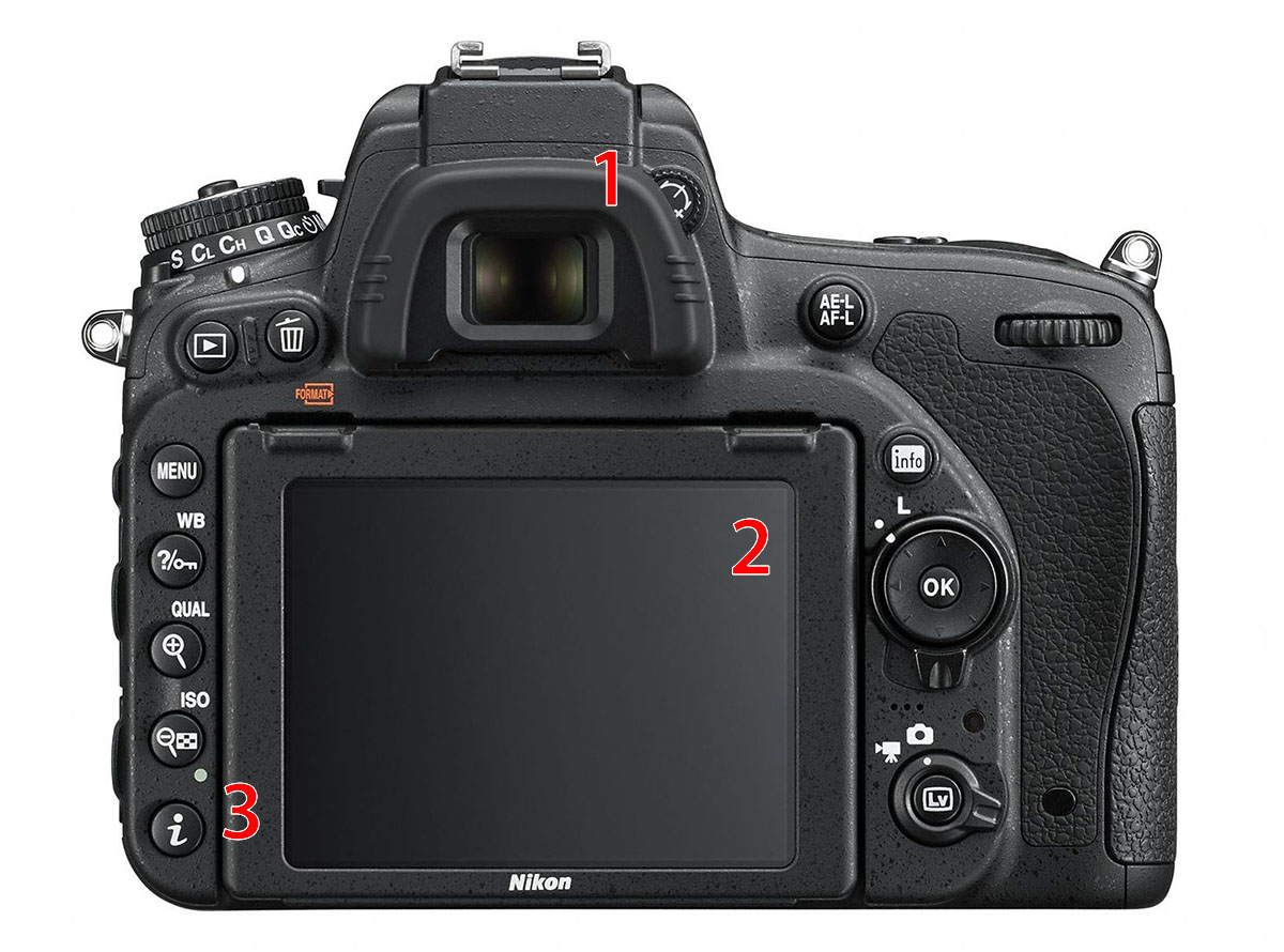 (3) -Una leggera riorganizzazione dei pulsanti non cambia apprezzabilmente il modo d'uso della D750 rispetto ad altri corpi Nikon FX. Introdotto, a sinistra, il pulsante "i" separato dal pulsante "Info", per l'accesso al menu di scatto rapido.