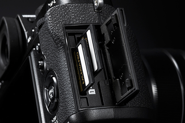 Il corpo è dotato di due slot per alloggiare altrettante schede in formato SD, entrambi compatibili con lo standard UHSII e sfruttabili per la registrazione sequenziale, per il backup e la registrazione di file RAW nello slot 1 e JPEG nello Slot 2 o per assegnare ad una delle due SD il compito di memorizzare le registrazioni video.