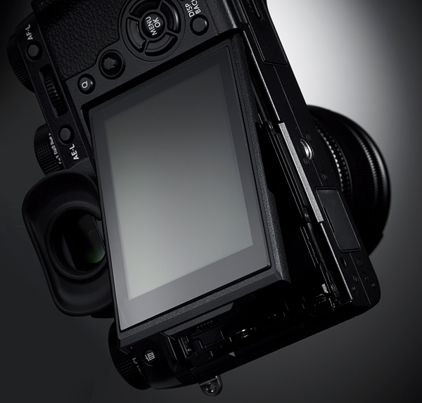 Anche lo schermo LCD ha ricevuto un importante aggiornamento, si tratta infatti del primo display inclinabile in tre direzioni della serie X: durante le riprese in orizzontale può essere orientato in alto e in basso, durante quelle in verticale verso l’alto. Al di là della maggiore versatilità, lo schermo ha una diagonale da 3”, 1,04 milioni di pixel ed realizzato con vetro rinforzato. Quando non è inclinato, è allineato al corpo della fotocamera.