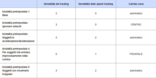 La modalità preimpostata 1 (Base) è l’impostazione standard per i soggetti in movimento ed è simile all’impostazione dell’autofocus dei modelli precedenti. La modalità preimpostata 2 è utile per ignorare gli ostacoli, ovvero quando oggetti differenti dal soggetto entrano nelll’area di messa a fuoco. Si passa alla terza modalità dedicata ai soggetti in accelerazione e decelerazione, ovvero soggetti che cambiano velocità di movimento in maniera evidente. Quarta e quinta modalità sono dedicate rispettivamente ai soggetti che entrano improvvisamente nell’area di messa a fuoco (dà priorità ai soggetti più vicini alla fotocamera) e ai soggetti che si spostano con movimenti irregolari.