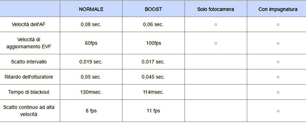 A scanso di equivoci, come è evidente dal prospetto ufficiale riportato di seguito, la modalità Boost è attivabile anche senza Vertical Power Booster Grip, ma in tal caso, introduce un miglioramento limitato alla velocità dell’AF e dell’aggiornamento dell’EVF. Con in battery grip e le due batterie è possibile migliorare le prestazioni di ulteriori parametri.