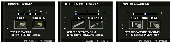Il profondo rinnovamento del sistema di messa a fuoco si riscontra anche analizzando i tre parametri di funzionamento dell’AF-C. E’ ora possibile infatti regolare in maniera dettagliata come la fotocamera segue i soggetti in movimento all’interno del fotogramma e in quale punto del fotogramma viene data priorità alla messa a fuoco. Sensibilità del tracking, sensibilità dello speed tracking e cambio zona sono i tre parametri che danno vita a cinque diverse combinazioni preimpostate, più una sesta personalizzabile dall’utente.