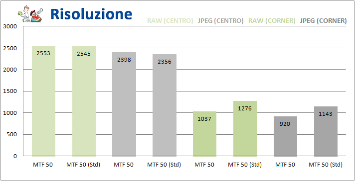 Il livello di dettaglio è nella media per un sensore da 24 Mpixel, ma la presenza del filtro AA e una pesante elaborazione de-noise del JPEG penalizzano la nitidezza complessiva, ben riassunta da un dato MTF (al centro) inferiore alla media. Molto basso il dato ai margini del fotogramma, indice di una caduta di nitidezza molto rilevante patita da quest'ottica ai bordi dell'immagine.