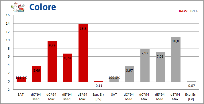 Perfetto il comportamento cromatico con il Picture Style "fedele": errori eccezionalmente contenuti e saturazione ottimale. Con il Picture Style "standard", qui mostrato, l'immagine appare più satura e accattivante, ma senza che questo impatti troppo sugli errori cromatici - complessivamente, un ottimo compromesso tra accuratezza e impatto emotivo.