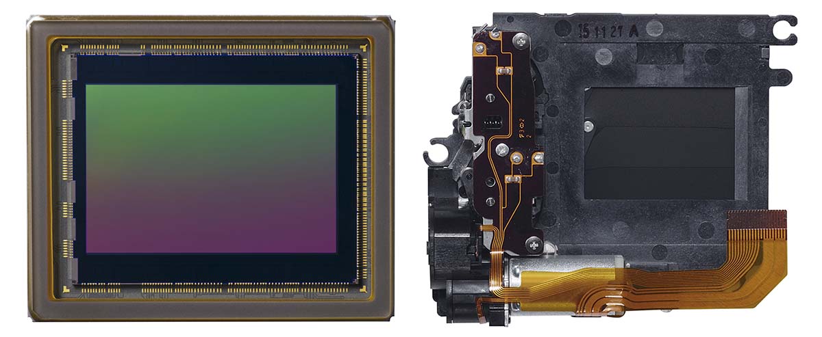 A sinistra, il nuovo sensore X-Trans CMOS III da 24 Mpixel. A destra, il blocco otturatore, che è ora in grade di raggiungere 1/8000s.