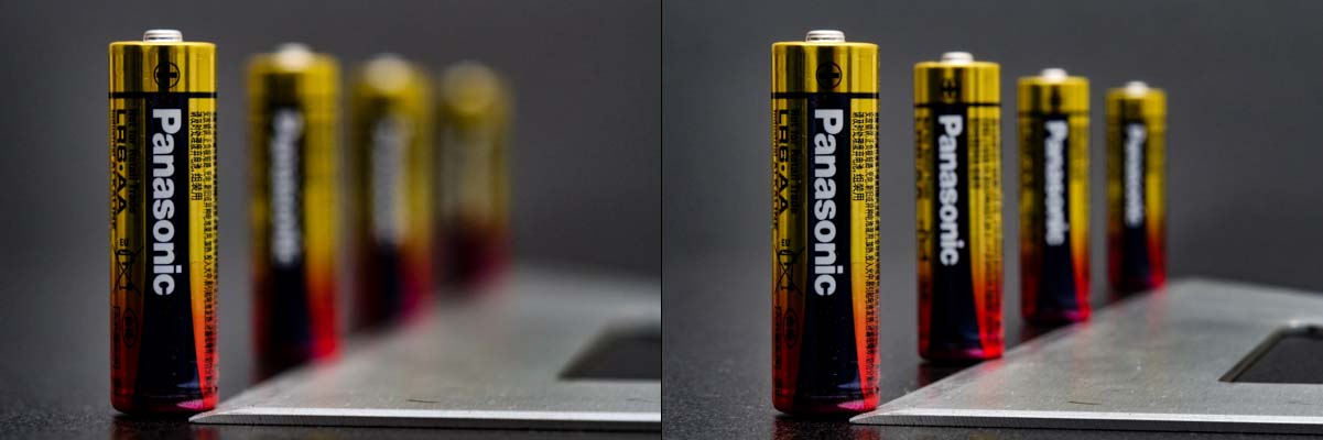 Post-focus e focus stack alla prova: le prime due immagini mostrano due foto tradizionali scatate a f/4 (a sinistra) e f/16. Data la ridotta distanza di messa a fuoco, anche alla massima chiusura il secondo riferimento è già visibilmente fuori fuoco.