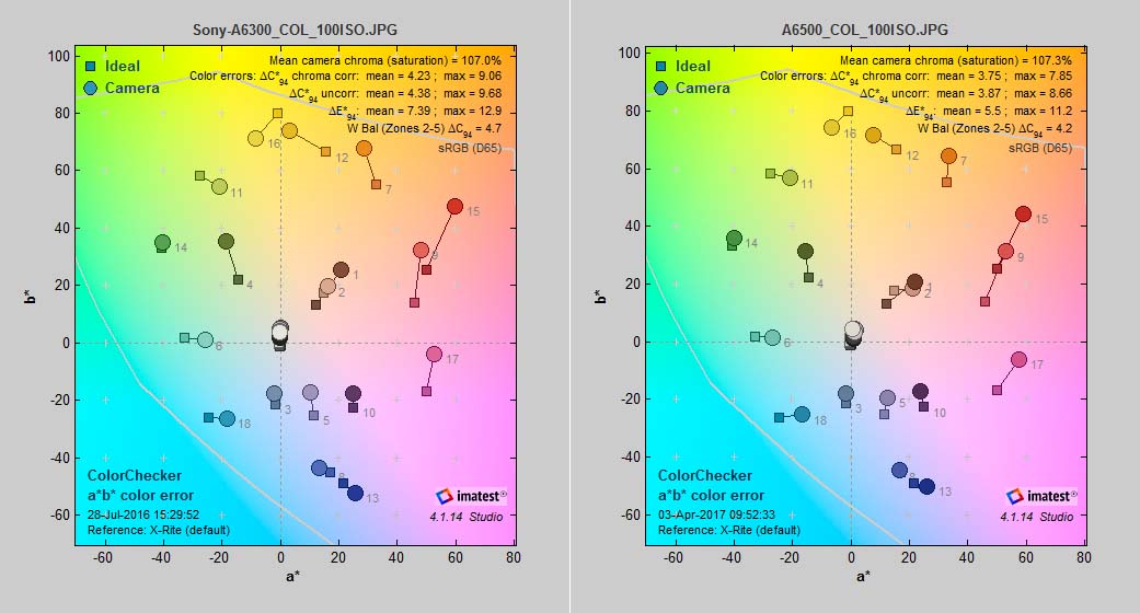 A sinistra: A6300. A destra: A6500. La resa cromatica del JPEG in-camera, molto simile per entrambe, è leggermente migliore nel caso della A6500 grazie al miglior punto di bianco (dC 94 4,2 contro 4,7); in entrambi i casi, l'errore è decisamente elevato.