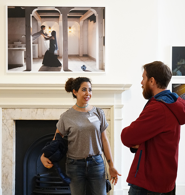 I due vincitori Tasneem Alsultan e Alessio Romenzi chiacchierano durante l'esposizione delle foto premiate alla Somerset House di Londra