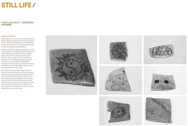 Molto crudo il lavoro che ha vinto nella categoria Natura Morta (Still Life). Il fotografo colombiano Henry Agudelo getta luce sul fenomeno delle sparizioni in Colombia, paese in cui il difficile processo di pace tra le forze governative e le FARC continua a lasciare dietro di sé una scia di morti e di persone scomparse. Lavorando a fianco di uno dei medici forensi che cerca di dare un'identità ai corpi ritrovati il fotografo ha messo insieme un portfolio di pezzi di pelle che portano su di sé alcuni segni che potrebbero essere l'ultima speranza per i parenti per dare un nome ai cadaveri, spesso irriconoscibili o addirittura smembrati. I pezzi di pelle coi tatuaggi, trattati per la conservazione, a prima vista potrebbero essere scambiati per altro, ma avvicinarsi alle stampe rende evidente la vera natura degli scatti e con essa porta la consapevolezza di questo continuo fatto di cronaca all'osservatore con la potenza di un pugno allo stomaco. Di tutt'altro tono il lavoro del giapponese Shinya Masuda, che in maniera quasi concettuale giustappone immagini di cibo marcente a quelle del gioco di carte giapponese Hanafuda. Gioca invece con le ombre il terzo classificato, il danese Christoffer Askman.