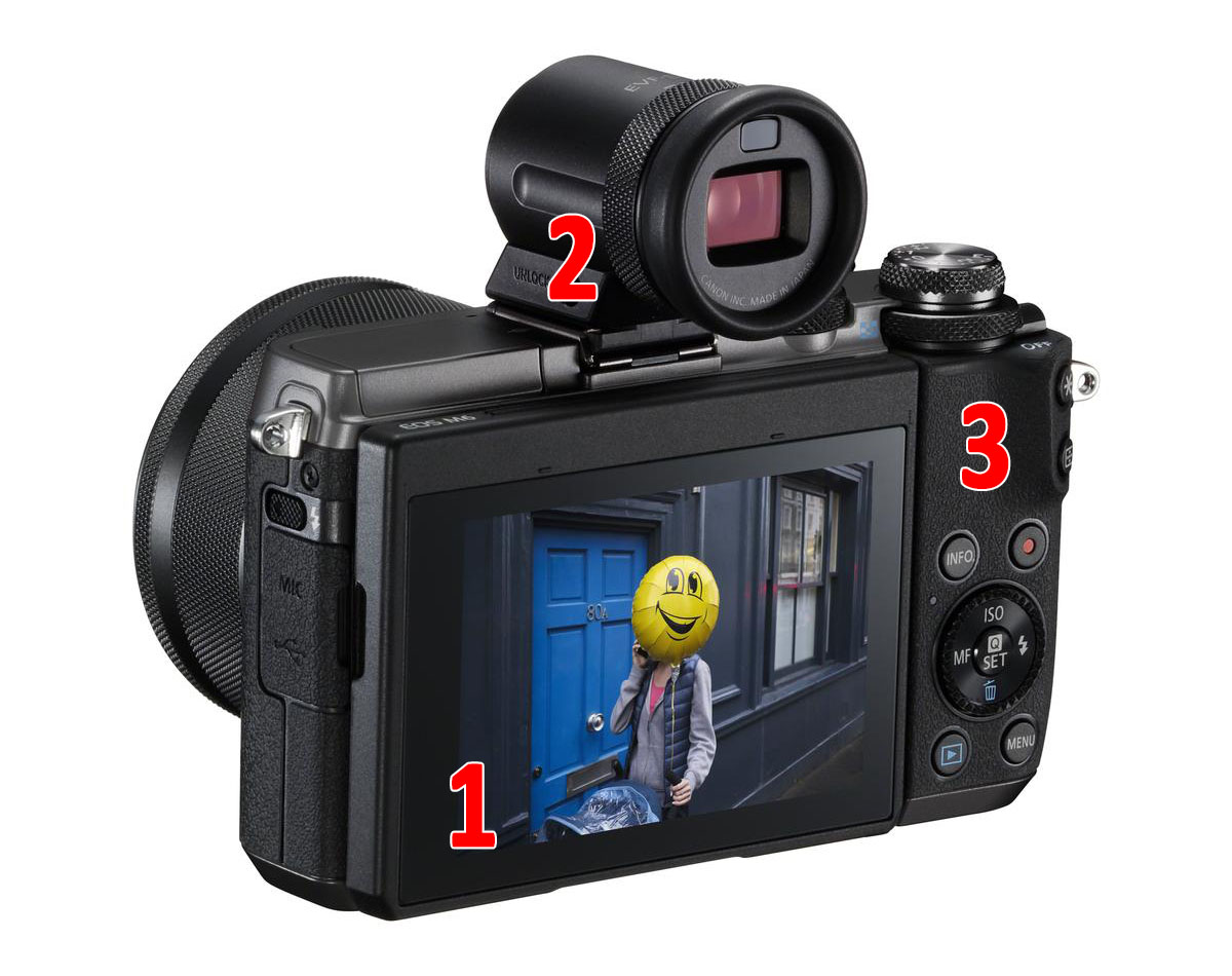 1 – Il display posteriore da 3" (1.040.000 punti di risoluzione) è touchscreen e basculante – può essere orientato di circa 45° verso il basso e di 180° verso l'alto, in posizione idonea per l'autoscatto (che può essere effettuato anche con un tocco sul display); è stato però eliminato il peculiare meccanismo scorrevole che consentiva di far sporgere maggiormente il display dal corpo macchina in "posizione sefie".