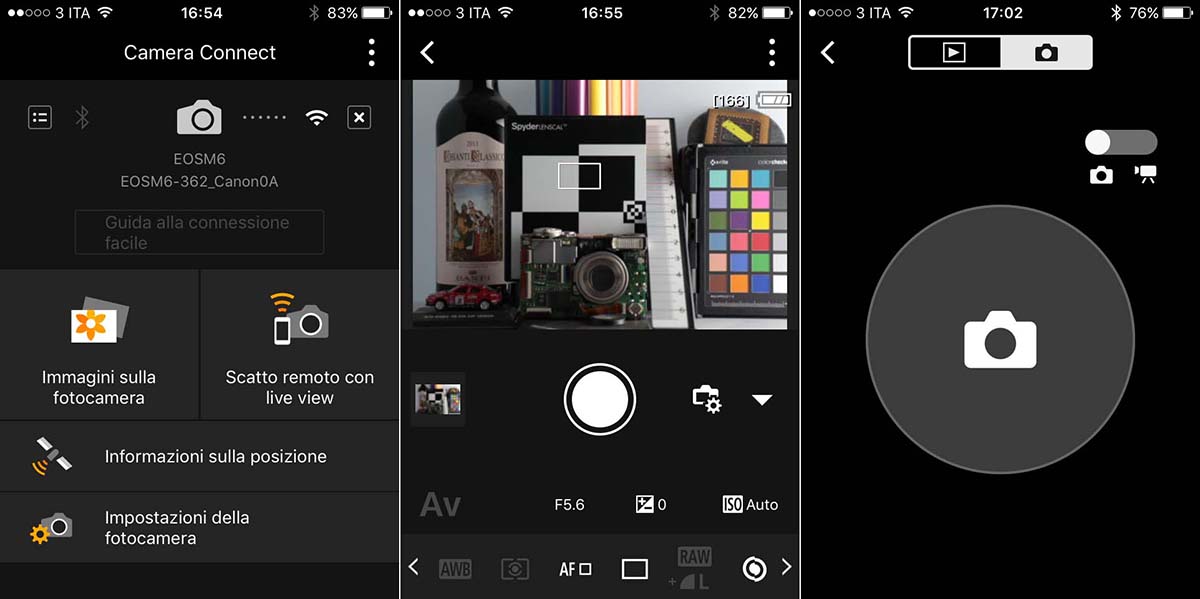L'App Camera Connet. Al centro in modalità Wi-Fi, con anteprima della scena inquadrata e completo controllo della fotocamera; a destra in modalità Bluetooth, con sola funzione di scatto remoto.
