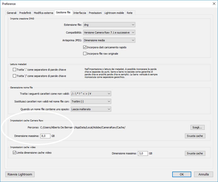 Lightroom utilizza la cache per memorizzare le anteprime di visualizzazione, migliorando la reattività complessiva del programma. Il valore di default, 1 GB, è piuttosto ridotto per un utilizzo intensivo - salvo problemi di spazio, consigliamo di portare questo valore a 8 GB o più; utile anche, come sempre, utilizzare il disco più veloce disponibile per la cache.