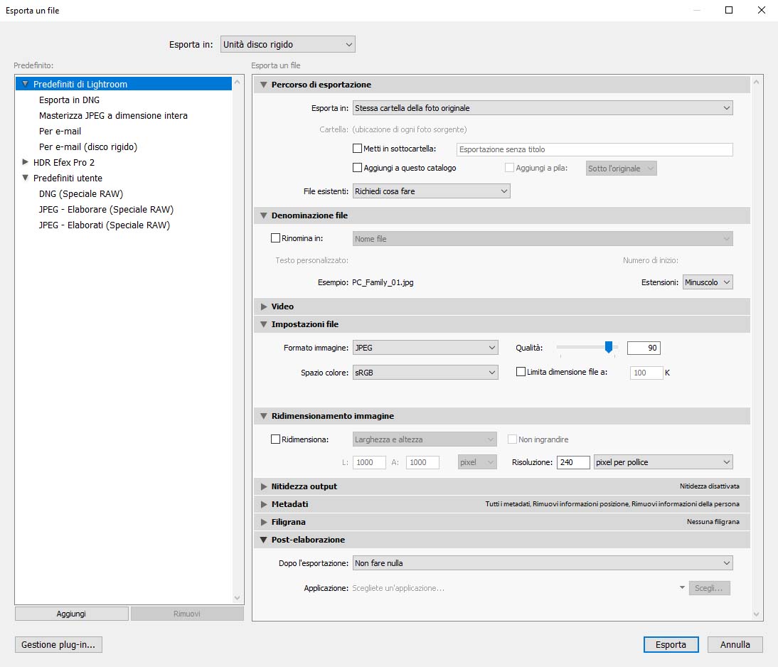 Comparirà una finestra di dialogo in cui sarà possibile scegliere posizione, nome, formato (è possibile esportare anche in PSD, TIFF o DNG se lo si desidera), lo spazio colore, eventualmente la dimensione (anche basata su uno solo dei due lati), applicare se lo si desidera un'ulteriore sharpening al JPEG, modificare i metadati o applicare un watermark.