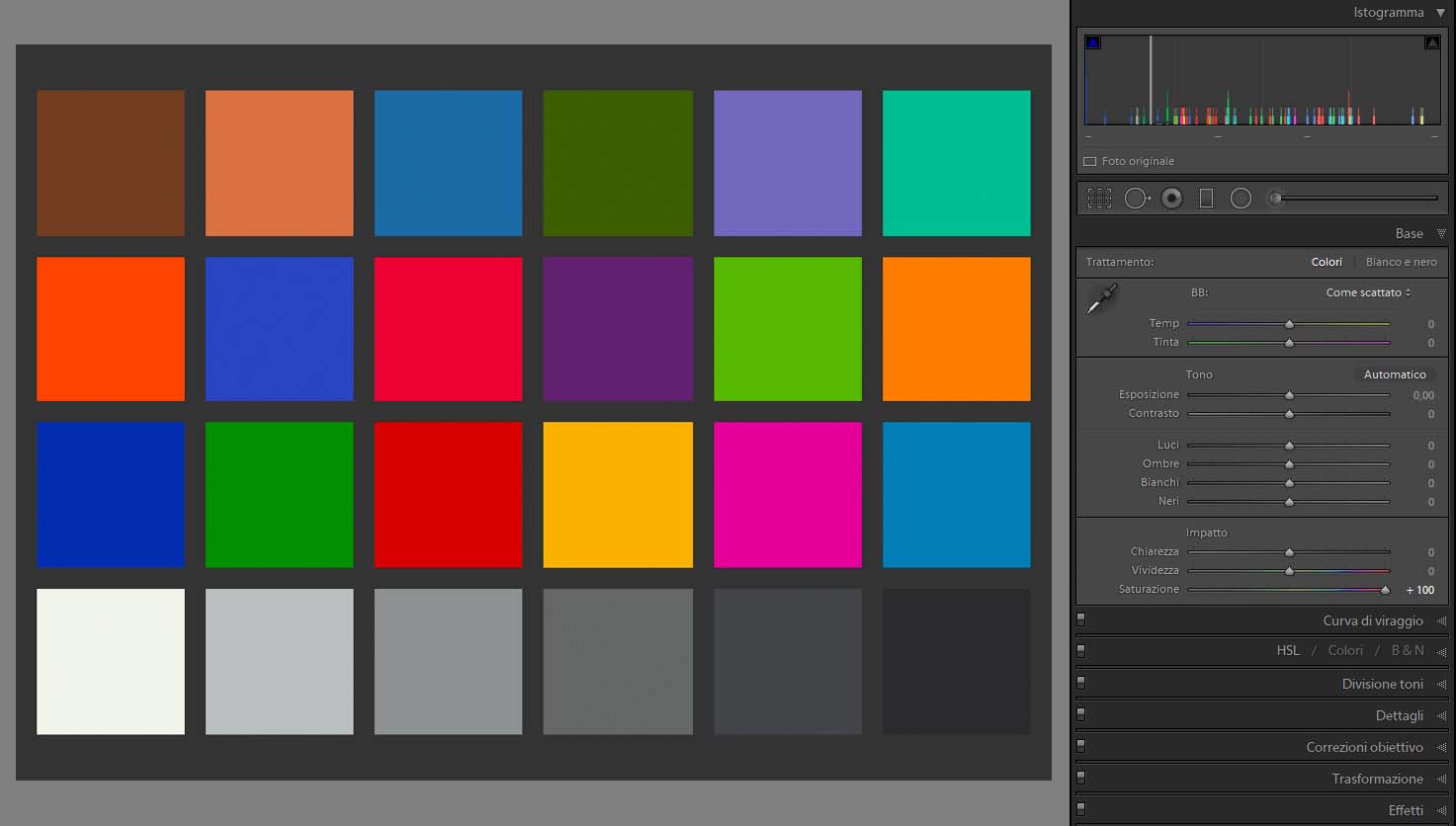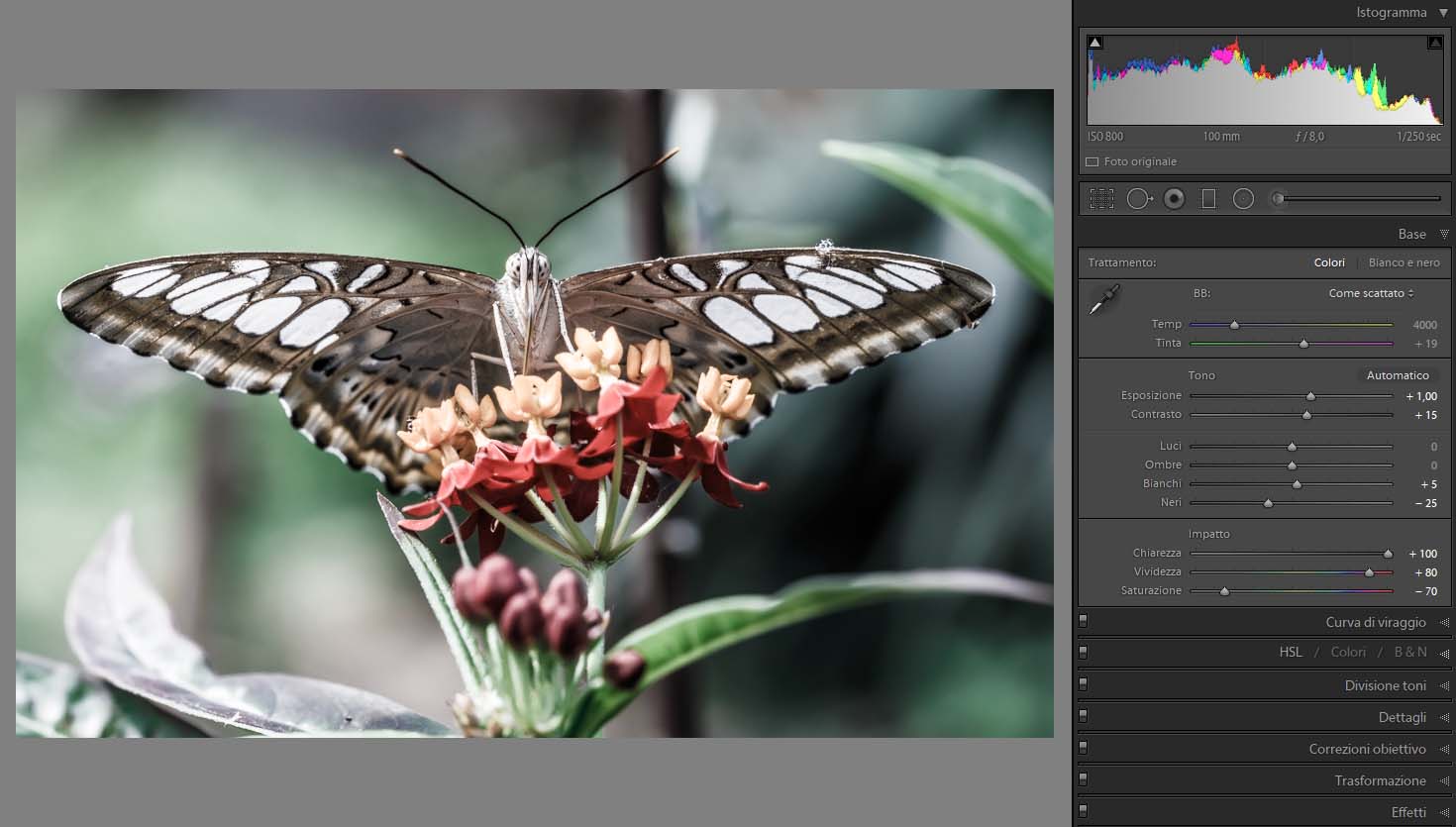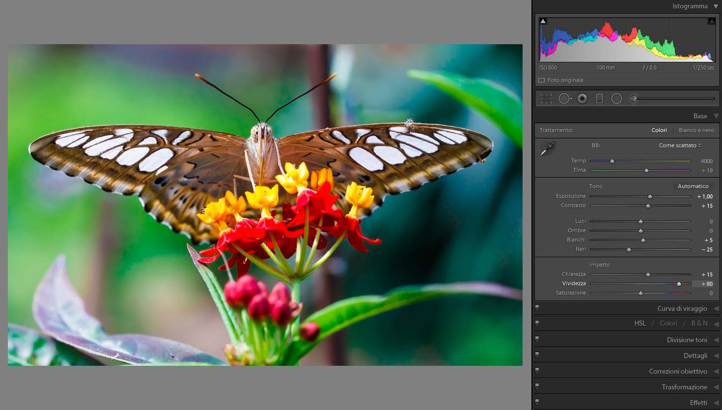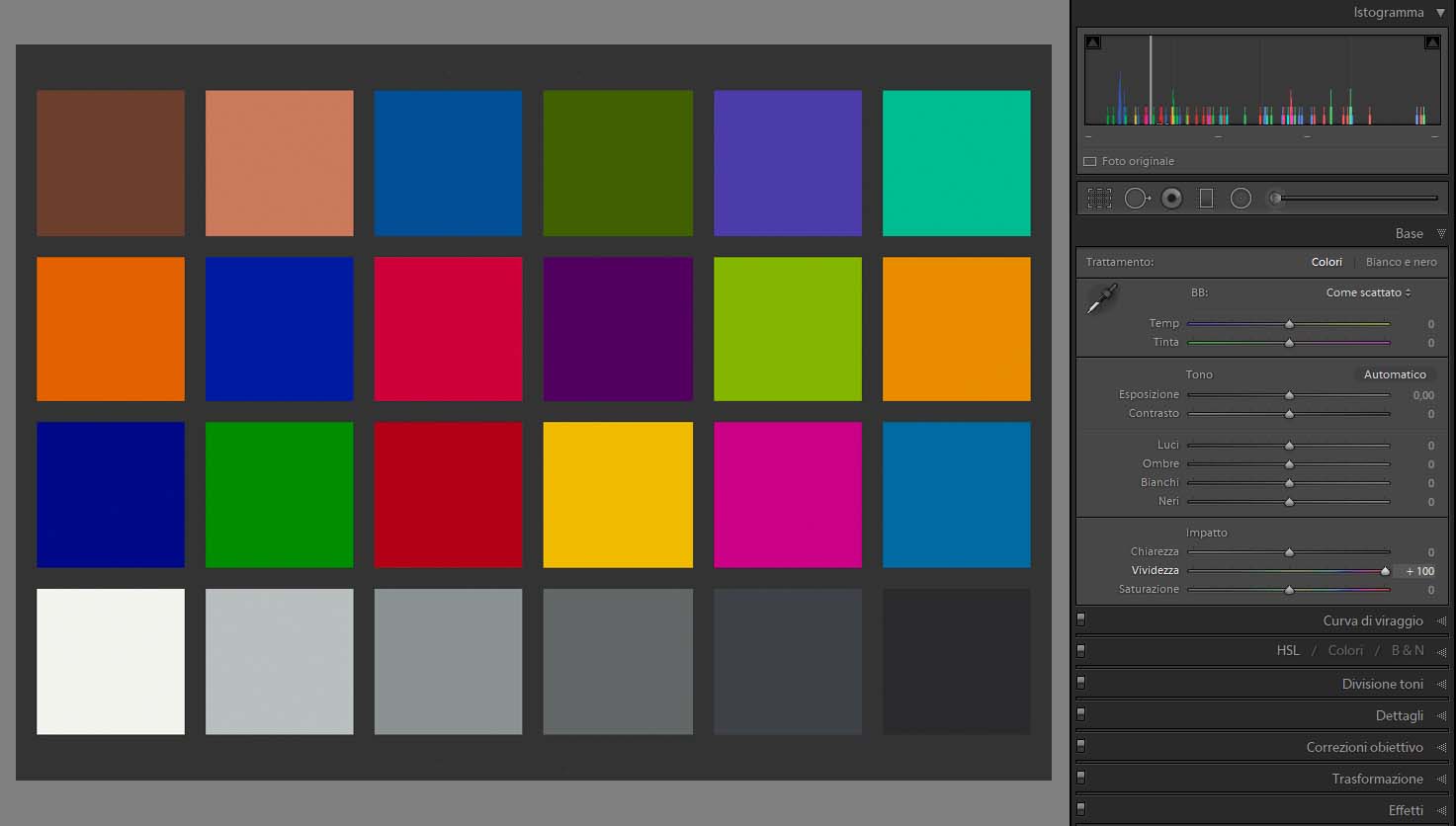 Gli ultimi due controlli del pannello Base sono dedicati alla saturazione dei colori. Il più intuitivo e "banale" dei due è Saturazione che, come ci si aspetta, incrementa o riduce la saturazione di tutti i colori, equamente e indistintamente. Riducendo al minimo Saturazione (-100), l'immagine diventa bianco/nero.
