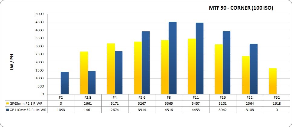 Il 63mm, che durante l'uso abbiamo apprezzato per la sua compattezza e leggerezza, è uno standard già molto nitido. Al centro del fotogramma, i punteggi MTF partono già oltre le 3000 LW/PH a tutta apertura - un risultato che altri sistemi raggiungono a fatica col miglior obiettivo al miglior diaframma di lavoro. Il massimo della nitidezza si raggiunge a f/8, ma tra f/5.6 e f/11 la risposta è pressoché costante. Solo a partire da f/22 i punteggi scendono sotto quota 3000, e (comprensibilmente) crollano a f/32, laddove la diffrazione si fa sentire anche per il sistema GFX.