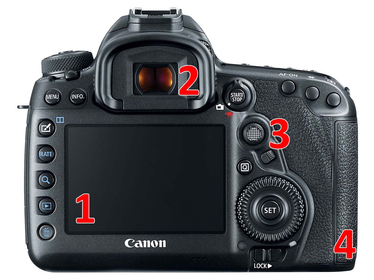 Piccole novità sul dorso: il joystick posteriore (Multicontroller) è ora zigrinato, com'è sempre stato per le 1D X, risultando più sicuro nell'azionamento. Più importante, il pulsante sottostante consente (per impostazione predefinita) di modificare la zona AF senza utilizzare combinazioni di tasti come era necessario fare con la 5D Mark III (Selezione p.to AF + M.fn).