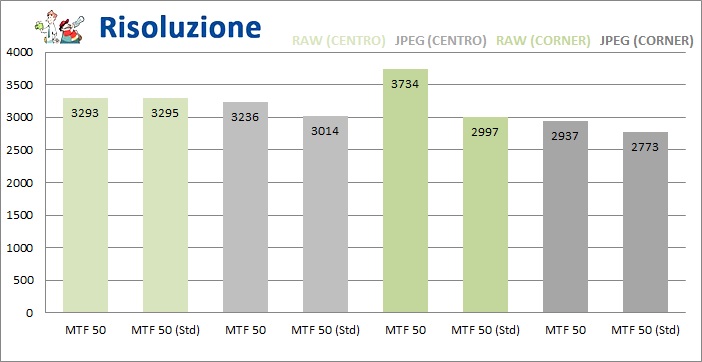 (irrealistico il dato MTF 50 RAW ai bordi non corretto – da considerare attendibile il dato standardizzato MTF 50 (Std)).