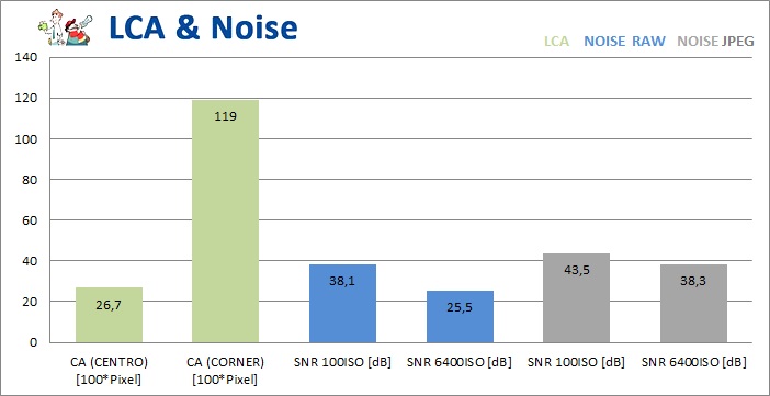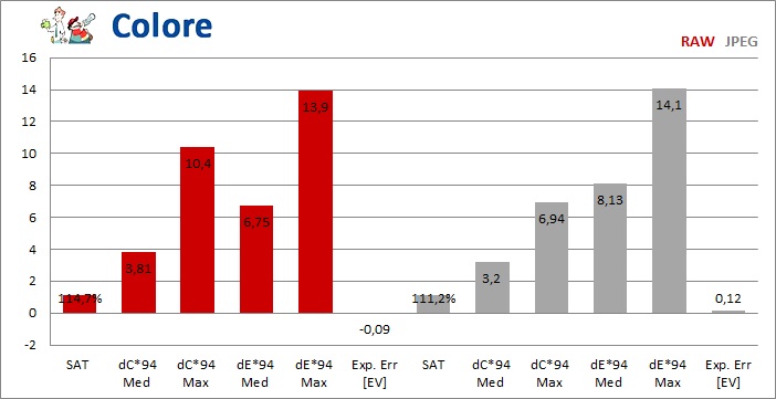 Buona la risposta cromatica dei file ottenuti dai RAW (dopo bilanciamento del bianco) con sviluppo basato su calibrazione camera Standard. Ottima utilizzando la calibrazione "Fedele". Il comportamento è pressoché costante tra 100 e 12.800 ISO.