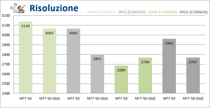 Punteggi elevati nonostante la presenza del filtro OLP fanno intuire l'elevato livello di dettaglio catturato dal sensore, anche ad altissima frequenza. Dettaglio che può essere facilmente estratto con uno sviluppo "energico" del RAW. Il JPEG Standard, viceversa, è già molto nitido e contrastato, e può essere immediatamente utilizzato senza ulteriori passaggi in Photoshop.