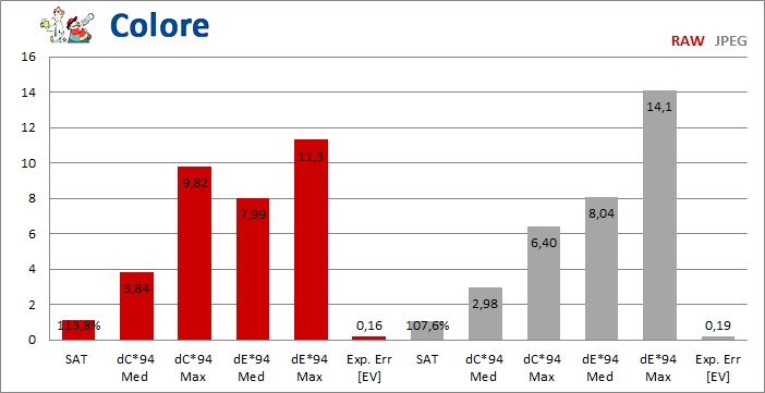 Buon comportamento cromatico generale, in cui spicca il JPEG Standard per i contenuti errori cromatici e il buon equilibrio complessivo. Come sempre, chi lo desidera ha a disposizione calibrazioni predefinite maggiormente votate alla fedeltà cromatica, con cui questa fotocamera sfiora l'eccellenza.
