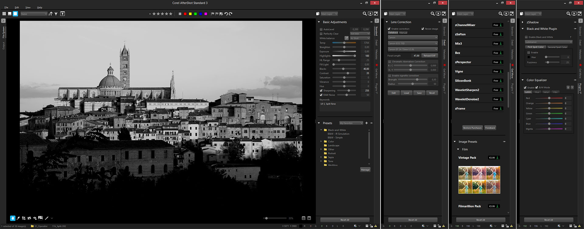 Con la versione Ultimate si acquista AfterShot, non AfterShot Pro. Gli strumenti disponibili sono ancora piuttosto limitati, soprattutto per quanto riguarda la gestione tonale avanzata. Disponibili diversi plug-in (molti dei quali free) che espandono le potenzialità del software, tra cui un ottimo equivalente del pannello HSL, non a caso installato di default. Disponibili altresì diversi preset (quasi tutti a pagamento).