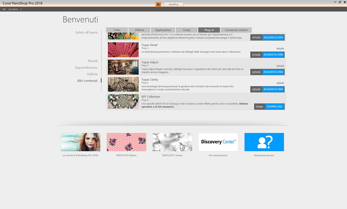 All'apertura del programma ci si imbatte immediatamente in una delle novità di questa versione, vale a dire la schermata di benvenuto (Home), che offre link a guide e tutorial, ma anche rimandi a plug-in (molti dei quali a pagamento) e ad altri prodotti accessori. Una soluzione tutto sommato pratica, a proposito della quale ribadiamo però quanto detto nel paragrafo precedente: all'interno di un prodotto commerciale, inserire tanti inviti a ulteriori acquisti è a nostro avviso inopportuno.