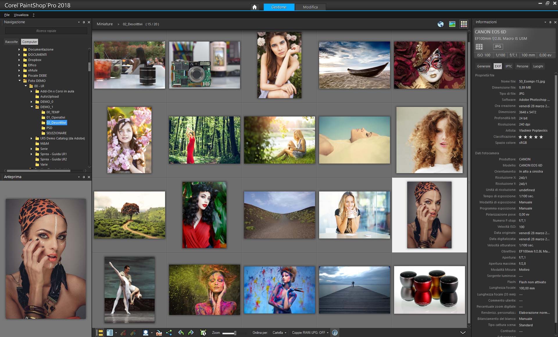 Disponibili le classiche viste a griglia, con miniature di dimensione regolabile, Anteprima (con tavolozza di miniature ancorabile o fluttuante) e mappa, con indicazione geografica del luogo di scatto. In tutti i casi, la colonna a destra mostra la cosiddetta tavolozza informazioni con dati sull'immagine (Generale, EXIF, IPTC, Persone, Luoghi). Nella parte inferiore, infine, si trovano gli strumenti di gestione, organizzazione e condivisione (copia/incolla impostazioni, rotazioni, pubblicazione sui social, raggruppamento immagini…); tra questi, anche l'avanzata funzione Trova persone (riconoscimento dei volti).