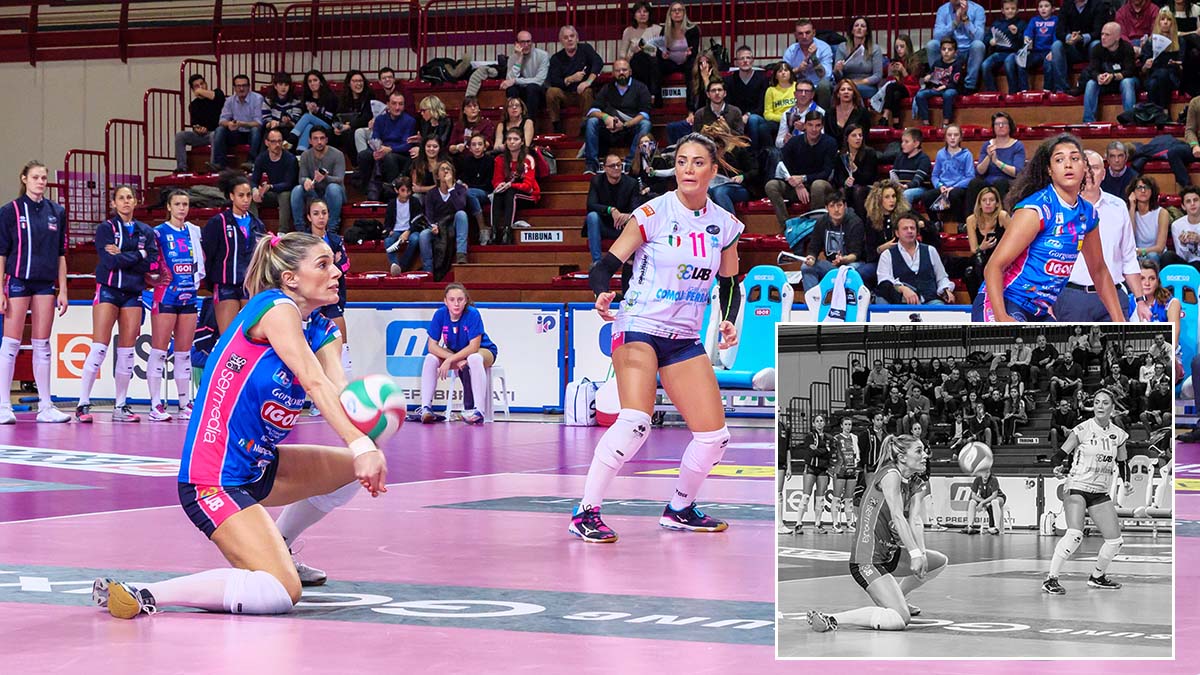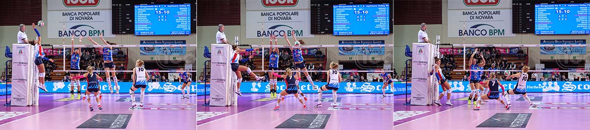 La raffica da 20 fps dura abbastanza a lungo da cogliere schiacciata (1), muro (2) e successivo recupero (3).