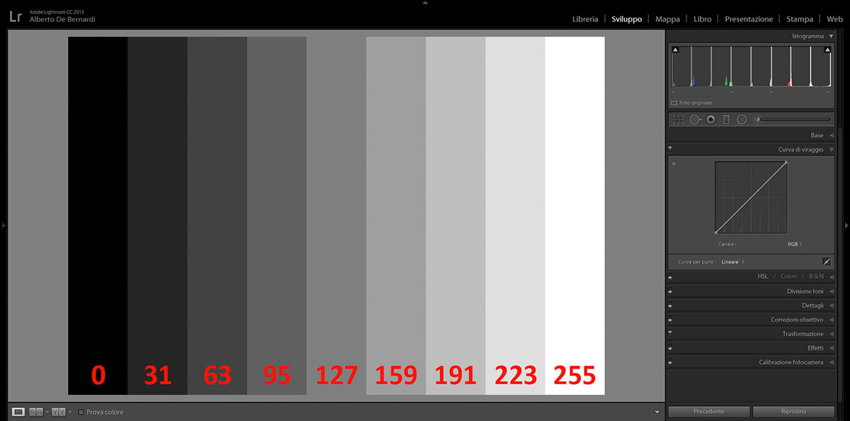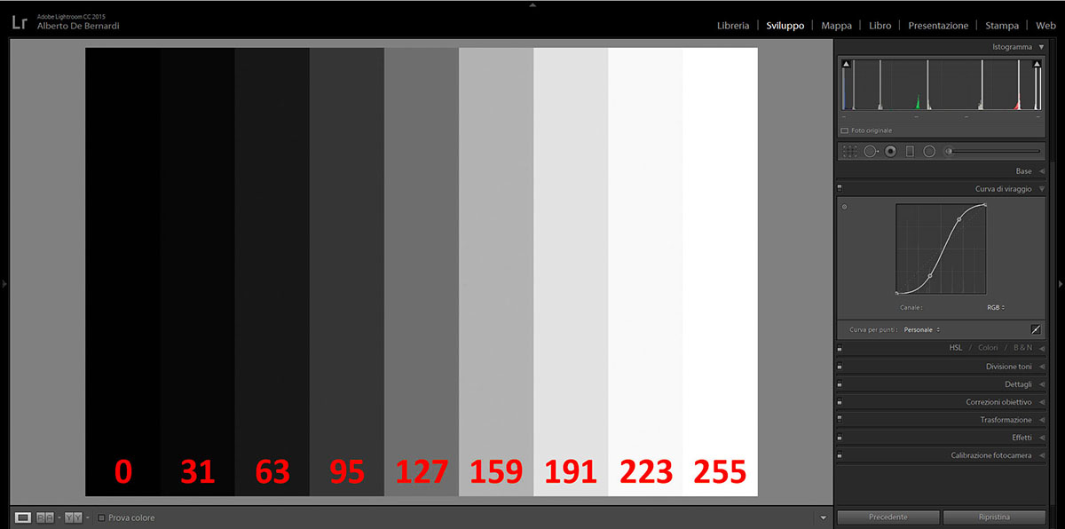Una curva di questo tipo, provare per credere, equivale a incrementare il cursore Contrasto – si può notare dall'istogramma lo stesso aumento di spaziatura tra le colonne centrali. Una curva a "S" rovesciata equivarrebbe viceversa a diminuire il cursore Contrasto.