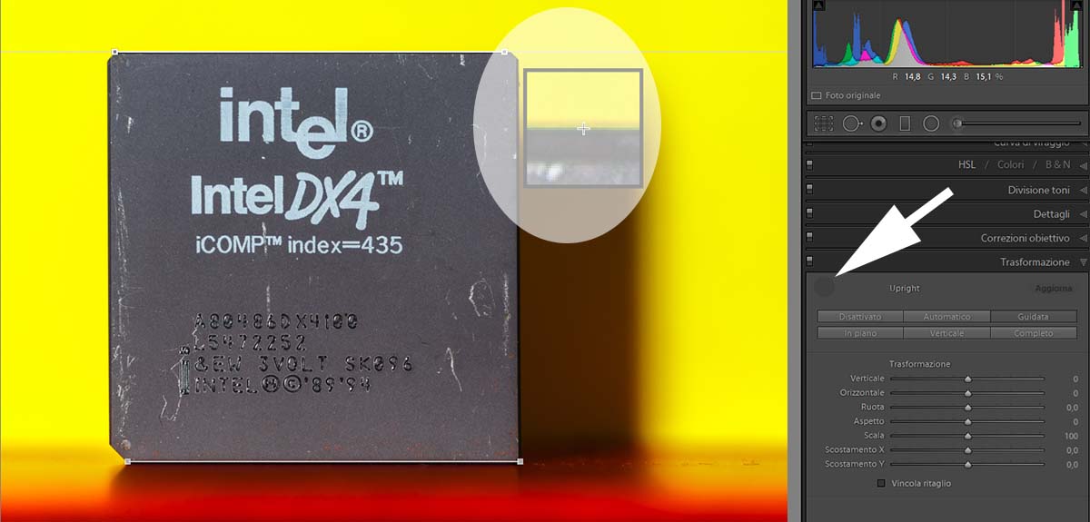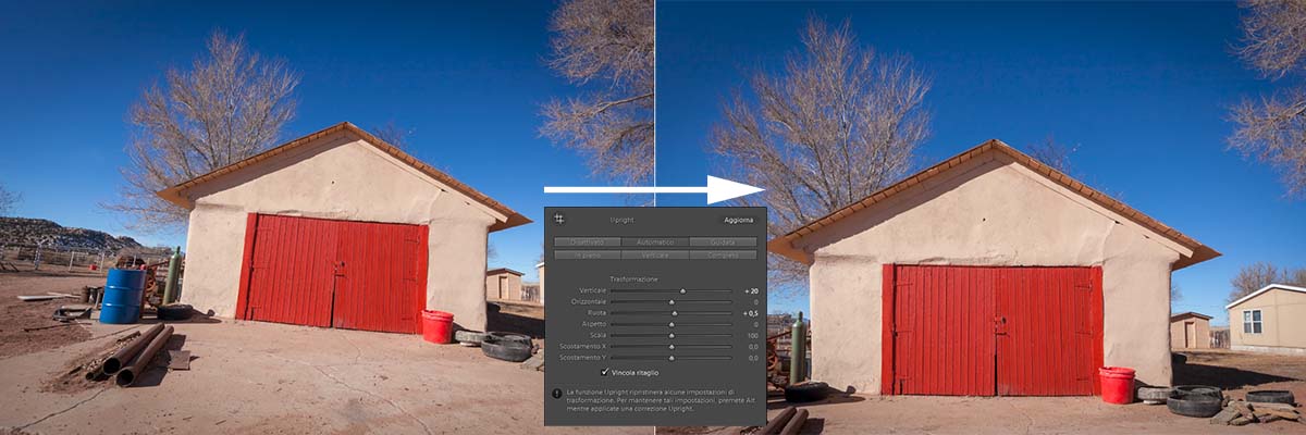 Una recente e utile aggiunta è data dalla modalità Upright Guidata, evoluzione del precedente Righello, che effettua una correzione di rotazione e prospettiva sulla base di linee di riferimento tracciate dal fotografo (da un minimo di due a un massimo di quattro). Non sempre sono disponibili riferimenti idonei all'interno dell'immagine ma, quando succede, basta premere il pulsante [Guidata] o cliccare sullo strumento Upright guidato in alto a sinistra (Shift + T) e tracciare due linee, orizzontali e verticali, per ottenere una correzione mirata ed efficace.